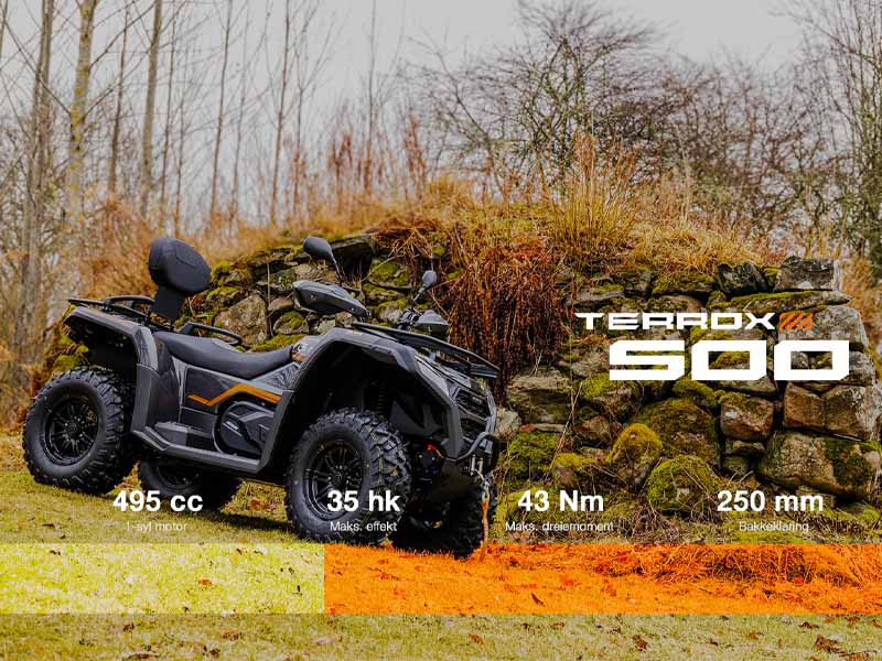 TERROX 500 er en robust og smidig arbeidsmaskin bygget for å tåle den daglige slitasjen. Den væskekjølte 495 cc-motoren leverer jevn kraft, mens automatisk CVT og EPS gir lett og kontrollert kjøring.